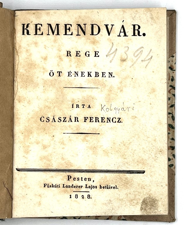 CSÁSZÁR Ferencz: Kemendvár – Rege öt énekben. Pesten, 1828. Füskúti Landerer Lajos bet. 156 [4 üres] p. Első kiadás! Korabeli félvászon kötésben, a kiadói papírborítók a könyvtestbe kötve. Ritka mű.