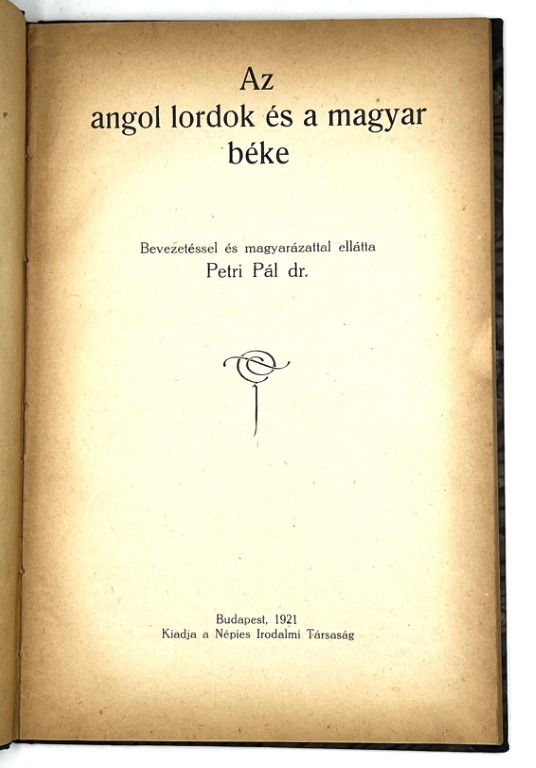 Az angol lordok és a magyar béke. Mindenkinek, ki szegény magyar hazánkat igazán szereti s annak jövőjét szívén viseli, meg kell ismernie az ú. n. trianoni békeszerződést, amely országunk boldogulására végzetesen hatott s emellett jóformán egész délkeleti Európa politikai és gazdasági helyzetét is károsan befolyásolta…