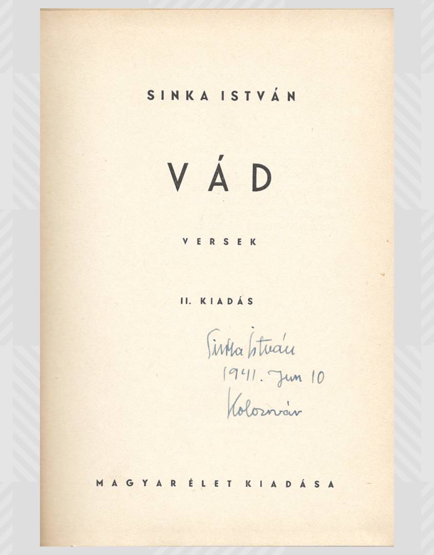 Kiadói egészvászon kötésben. „Sinka István – 1941. jun. 10. – Kolozsvár” dedikált példány!